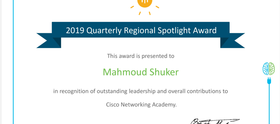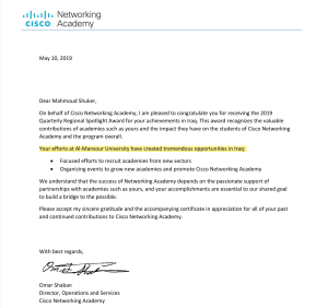 After a year-long effort in the follow-up, training and opening up of universities and academic institutions, the Cisco Networking Academy Director Dr. Mahmoud Shuker Mahmoud received an award certificate from Cisco International for his great efforts that contributed to the excellence of the Cisco Networking Academy in Iraq and made it the top notch not only locally but also at the regional level to ensure the name of Iraq remains always high and present in international scientific events.