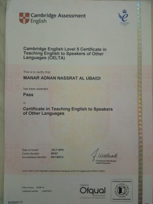 حصلت التدريسية المدرس المساعد منار عدنان على شهادة متقدمة في اللغة الانكليزية