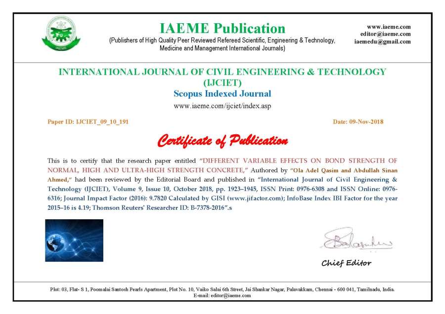 نشر التدريسييند. علا عادل قاسم و د.عبدالله سنان احمد التدريسيين في قسم الهندسة المدنية بحثا عالميا في مجلة: