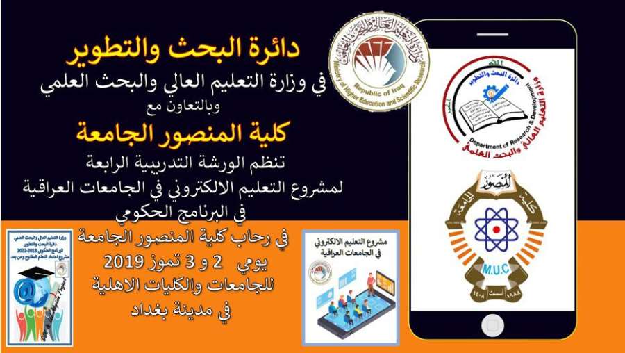 شارك كادر قسم هندسة الحاسوب في الورشه التدريبيه الرابعه لمشروع التعليم الإلكتروني في الجامعات و الكليات العراقية و التي أقيمت في رحاب كلية المنصور الجامعه يومي 2 و 3 تموز و بإشراف دائرة البحث و التطوير – وزارة التعليم العالي و البحث العلمي وبالتعاون مع دائرة تكنولوجيا المعلومات والاتصالات في كلية المنصور الجامعة ضمن البرنامج الحكومي لمشروع التعليم الألكتروني و برنامج التعليم عن بعد و مدى الحياة في الجامعات العراقيه. و في ختام الورشة تم توزيع شهادات المشاركه للحاضرين تثميناً لمشاركتهم الفاعله في الورشة التدريبيه.