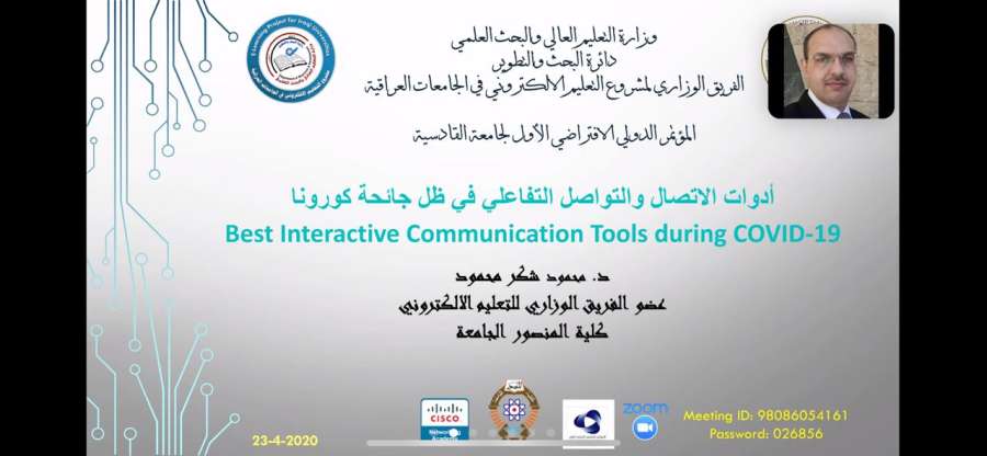 شارك السيد مدير دائرة تكنولوجيا المعلومات والاتصلات الدكتور المهندس محمود شكر محمود عضو الفريق الوزاري للتعليم الالكتروني في تقديم محاضرة ضمن جلسات مؤتمر جامعة القادسية الدولي الافتراضي الاول والمنعقد خلال الفترة من 22-23 نيسان 2020 وضمن محور التعليم الالكتروني قدم الدكتور محمود محاضرته عن أدوات التواصل والاتصال للتعليم التفاعلي خلال فترة جائحة كورونا تناول فيها عدداً من الادوات المهمة التي بأمكان التدريسي في جامعاتنا العراقية أو ضمن قطاعات الاعمال المختلفة الاعتماد عليها من أجل تحقيق التواصل التفاعلي مع الطلبة وفرق العمل المشتركة لضمان تحقيق التعليم المتزامن في العملية التعليمية واستدامة التواصل الفاعل مع الطلبة في وقت الحظر الوقائي المفروض على الجميع وخاصة المؤسسات التعليمية