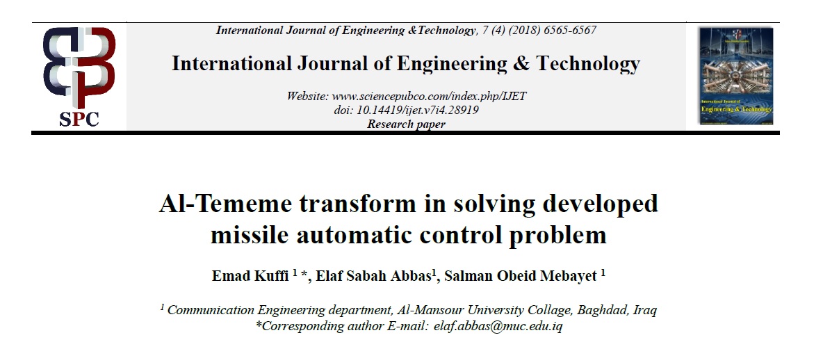 نشر بحث علمي من قبل الاستاذ المساعد الدكتور عماد عباس كوفي الساعدي مدير دائرة المختبرات و التدريسي في قسم هندسة الاتصالات مع م.د. سلمان عبيد و م.م.ايلاف صباح في أحدى المجلات العالمية والتي تقع ضمن تصنيفات سكوبس