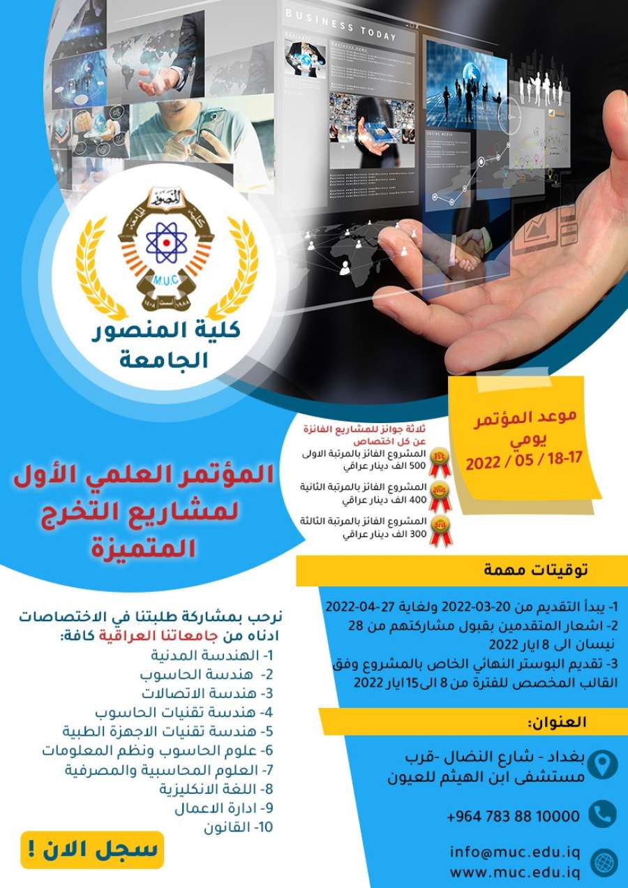 تقيم كلية المنصور الجامعة مؤتمرها العلمي الأول الخاص بمشاريع التخرج المتميزة للعام الدراسي (2021-2022) للفترة من 17-18 ايار 2022 والذي يهدف إلى ألقاء الضوء على أبرز أنجارات طلبة المرحلة الرابعة في مشاريع تخرجهم وإعطاءهم الفرصة لأثبات قدراتهم الابداعية والفكرية والدعوة لجميع طلبة المرحلة الرابعة في الجامعات العراقية كافة للمشاركة ضمن التخصصات المحددة ووفق الضوابط والشروط المبين تفاصيلها على صفحة المؤتمر، وستكون هنالك جوائز مادية وعينية للمشاريع الثلاث الفائزة عن كل اختصاص