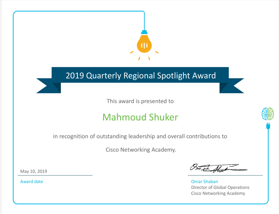 بعد جهود استمرت قرابة السنة في المتابعة والتدريب والانفتاح على الجامعات والمؤوسسات الاكاديمية حصل مدير أكاديمية سيسكو للشبكات الدكتور المهندس محمود شكر محمود على شهادة تقديرية من مؤوسسة سيسكو الدولية لجهوده الكبيرة التي أسهمت في تميز المركز الإقليمي لاكاديميات سيسكو في العراق وجعله في صدارة الاكاديميات ليس على المستوى المحلي فحسب وانما على مستوى دول المنطقة ليبقى دائماً اسم العراق عاليا وحاضرا في المحافل العلمية الدولية .