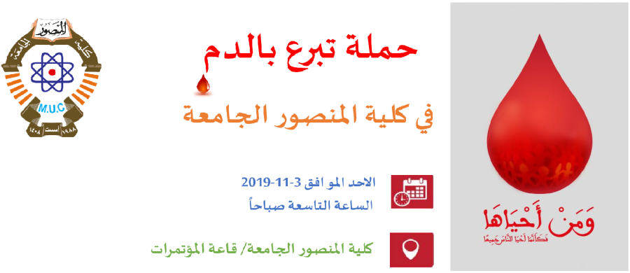 تهيبكلية المنصور الجامعةبمنتسبيها وطلبتها وخريجيها الاعزاء المشاركة الفاعلة في حملة التبرع بالدم دعماً لعراقنا الحبيب وابناءه الابطال والتي ستقام في رحاب كلية المنصور الجامعة يوم الاحد القادمالساعة التاسعة صباحاً