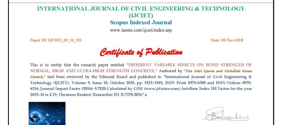 Dr. Ola Adel Qasim and Dr. Abdullah Sinan Ahmed in the Department of Civil Engineering Published a Research in the International journal entitled: