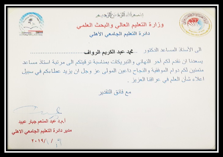 Assistant ProfessorDr. Mohammed Abdul kareem Al-Rawaf, Assistant Dean for Administrative Affairs and Head of Civil Engineering Department, was honored by the Minister of Higher Education and Scientific Research with a certificate of appreciation for Scientific promotion (Assistant Professor).