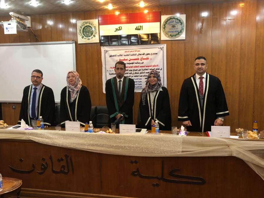 شارك الاستاذ المساعد الدكتور علي غني عباس في عضوية لجنة مناقشة رسالة الماجستير للطالب نجاح حسن سعدالموسومة الاحكام القانونية لتنفيذ النفقات العامة للدولة في كلية القانون الجامعة المستنصرية وتم تكريمه بكتاب شكر وتقدير من قبل السيد عميد كلية القانون الاستاذ المساعد الدكتور منجد منصور محمود