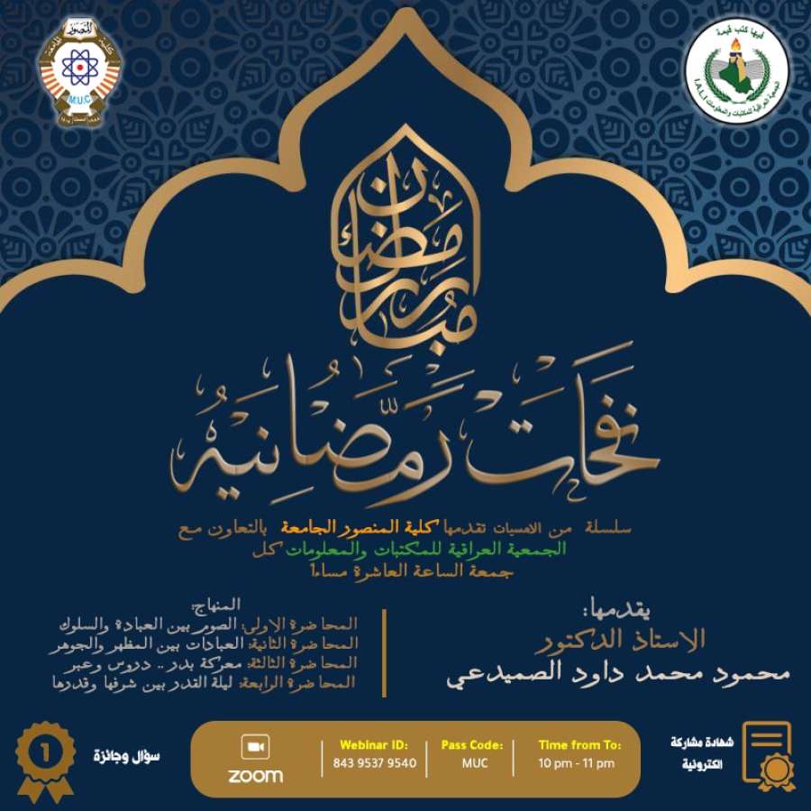 بمناسبة حلول شهر رمضان المبارك أعاده الله عليكم بالخير واليمن والبركه، وضمن فعاليات هذا الشهر الفضيل تقيم كلية المنصور الجامعة وبالتعاون مع الجمعية العراقية للمكتبات والمعلومات سلسلة امسيات رمضانيه الكترونية مساء كل جمعة تحت عنوان