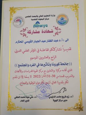 The participation of the Professor at Al-Mansour University College - Department of English Language (Prof. Dr. Abdul Ghaffar Abdul Jabbar) in a scientific conference held by the Psychological Research Center / Ministry of Higher Education and Scientific Research for the period from 30-31/3/ 2022 and with the tagged research