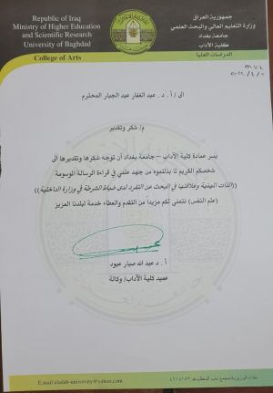 The participation of the Professor at Al-Mansour University College - Department of English Language (Prof. Dr. Abdul Ghaffar Abdul Jabbar) in a master's viva examination held in Baghdad University / College of Arts / Department of Psychology on 19th April 2022.