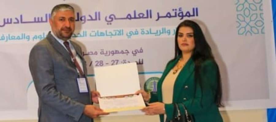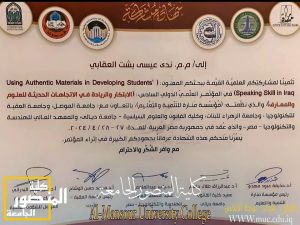 Participated as a teaching assistant in the English Department. Eng. Nada Issa Bisht Al-Aqabi at the Sixth International Scientific Conference (Innovation and Leadership in Modern Trends in Science and Knowledge) organized by the Higher Institute of Engineering and Technology, which was held in the Arab Republic of Egypt and with the participation of many Arab and foreign countries. I presented a research entitled Using Authentic Materials in Developing Students' Speaking Skills In Iraq, the teacher received the conference shield and a certificate of participation. The teacher, Nada Issa, stated that the conference was a valuable opportunity to showcase the academic experience of the teachers of Al-Mansour University College in front of the world, which came thanks to the great support provided by the dean of Al-Mansour University College and the presidency of the English Department by supporting scientific activities for the participation of teachers in conferences. International Arab and international universities.