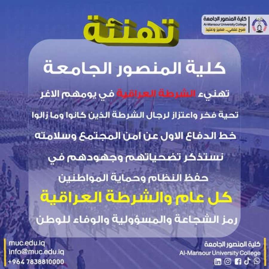تتقدم كلية المنصور الجامعة بالتهنئة والتقدير لرجال الشرطة الذين يحمون القانون ويصونون الامن ويقفون سدا منيعا بوجه الجريمة.