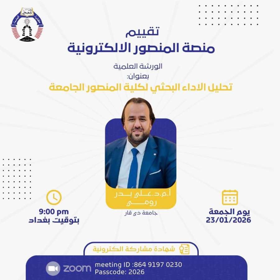 وتنطلق هذه السلسلة بمحاضرة سوف تقام يوم الجمعة الموافق 23/01/2026 في تمام الساعة التاسعة مساءً بتوقيت بغداد بعنوان تحليل الأداء البحثي كلية المنصور الجامعة يقدمها الأستاذ المساعد الدكتور علي بدر رومي مدير قسم ضمان الجودة والأداء الجامعي في جامعة ذي قار حيث تتناول المحاضرة محاور علمية تسلط الضوء على آليات تحليل الأداء البحثي ومؤشرات الجودة والتقييم المؤسسي.
